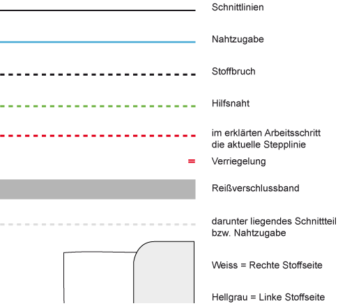 Am Schnitt des vorderen Hosenteils sind alle notwendigen Linien genau beschriftet: