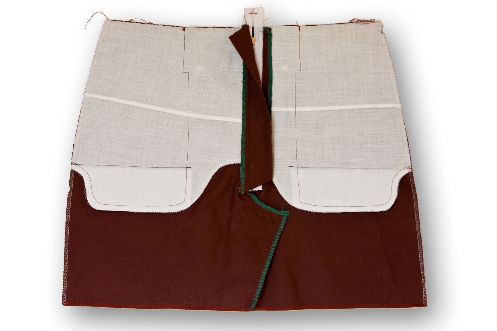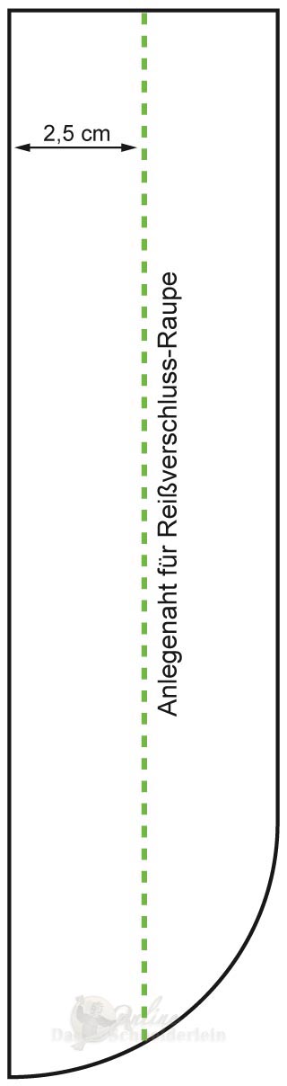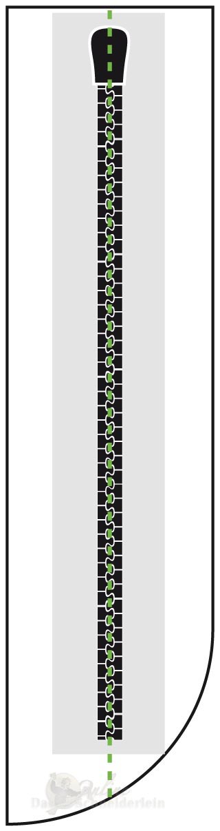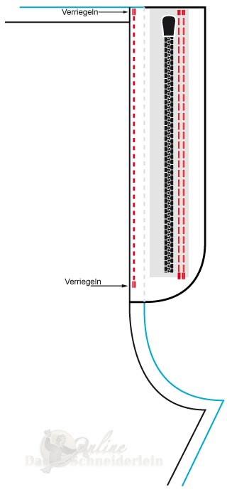 3. das rechte Reißverschlussband nun am Schlitzbeleg mit 2 Nähten (an der Seite mit der Rundung) feststeppen. Anschließend kann die Hilfsnaht wieder entfernt werden.