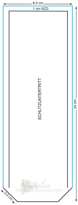 2. Schlitzuntertritt zur Hälfte bügeln und dabei die schrägen Ecken einschlagen. Bei korrekter Anwendung dieses Schrittes sieht dein Schlitzuntertritt wie in der rechten Zeichnung aus.